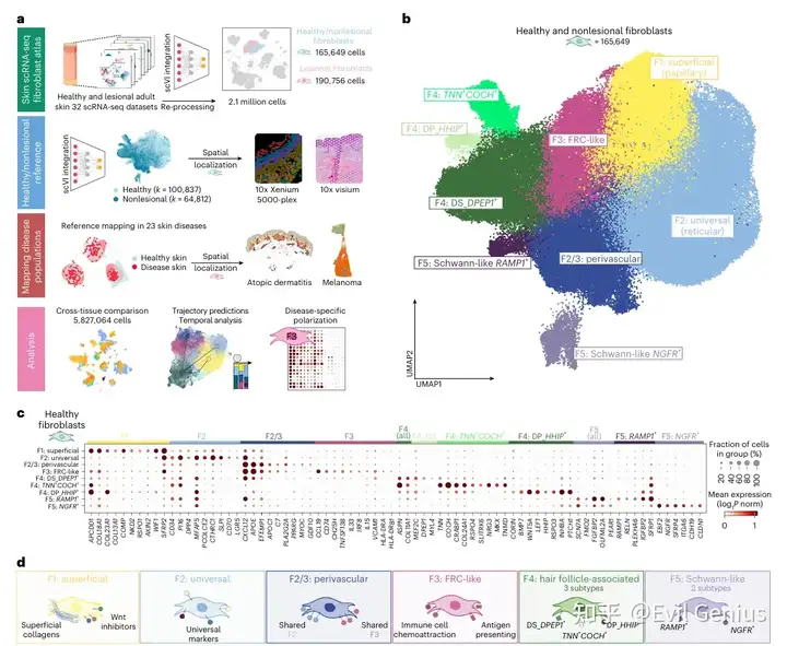 结论:尽管人体组织间存在显著生物物理特性差异,但结果证实了既往报道的跨组织成纤维细胞状态在皮肤中的普遍存在。更重要的是,首次提出F2/3:血管周成纤维细胞和F5:NGFR+(神经相关)成纤维细胞为新型跨组织保守群体。