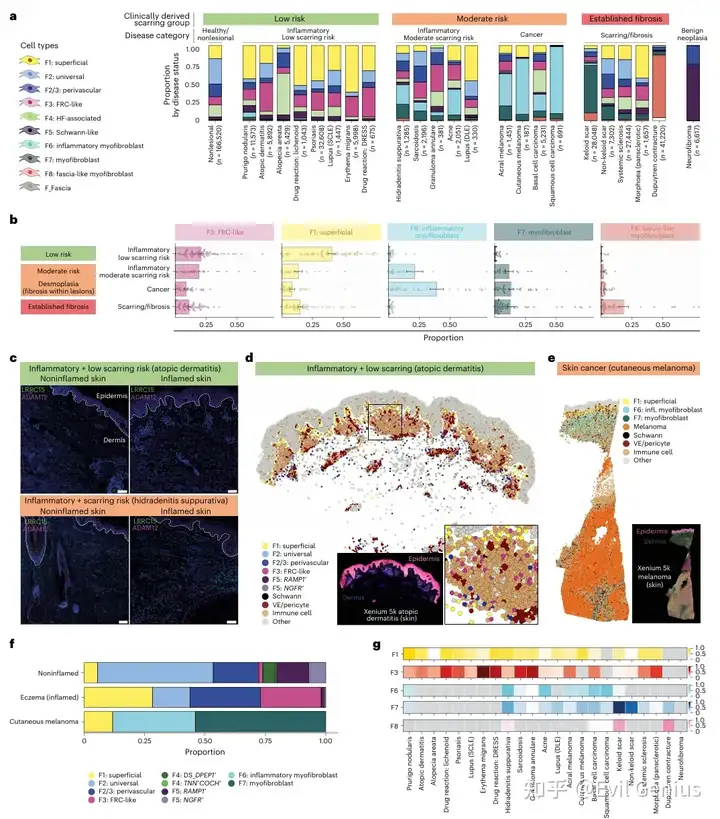 总结:发现证实了不同瘢痕形成风险的皮肤病具有独特的基质组成。F6:炎症性肌成纤维细胞在具瘢痕风险的疾病中出现,但在已形成的纤维化中相对少见,提示其可能是向F7:肌成纤维细胞分化的中间状态。