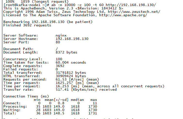 上面都是理论。我开了一台1c1g虚拟机实用ab测试结果如下: