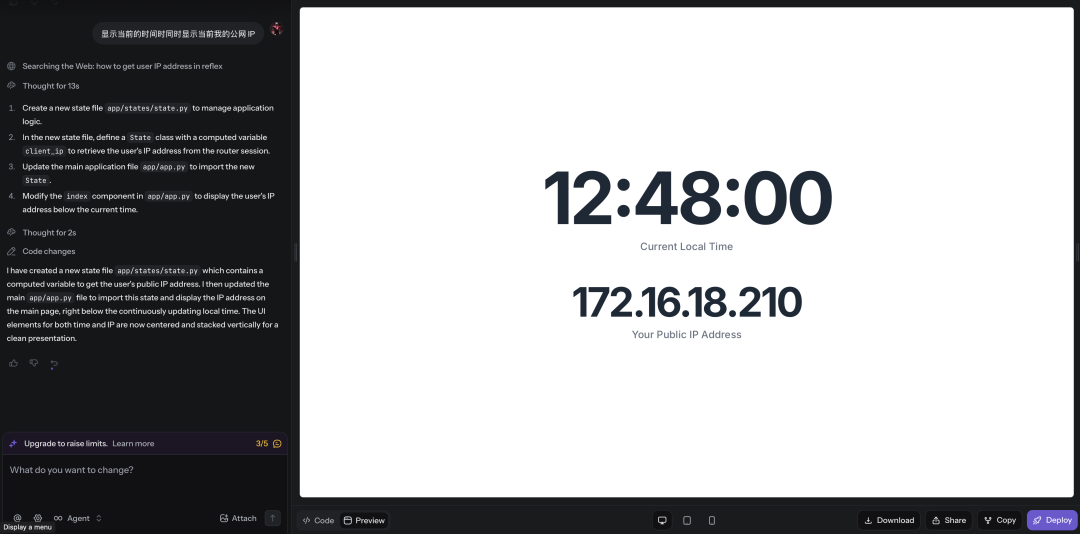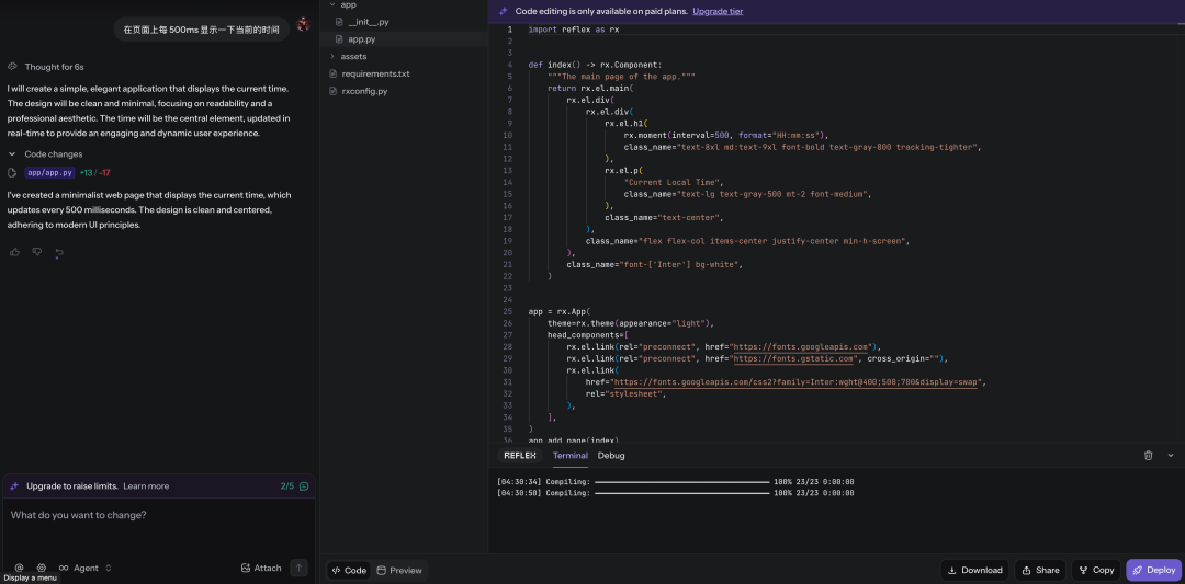 我只需要用自然语言描述想要的功能,比如“生成一个页面,在页面上每 500ms 刷新下当前的时间”,AI就能直接生成可运行的Python代码。