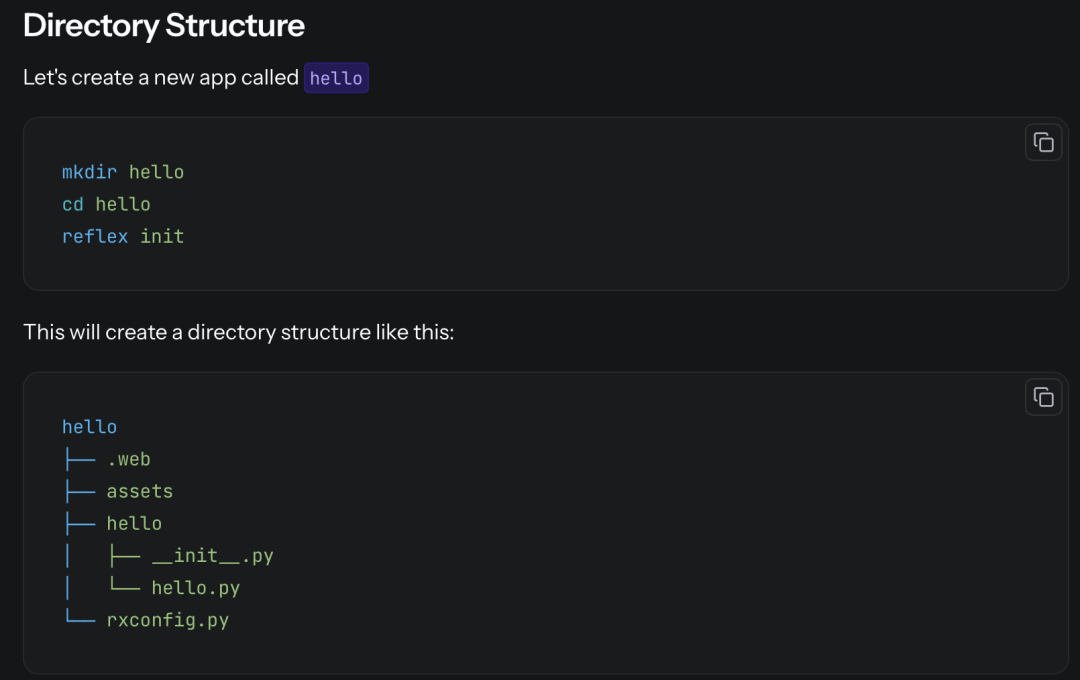Reflex最让我惊艳的就是它真正的纯Python开发体验。我不需要写一行前端代码,就能构建出功能完整的Web应用。只需要几行命令: