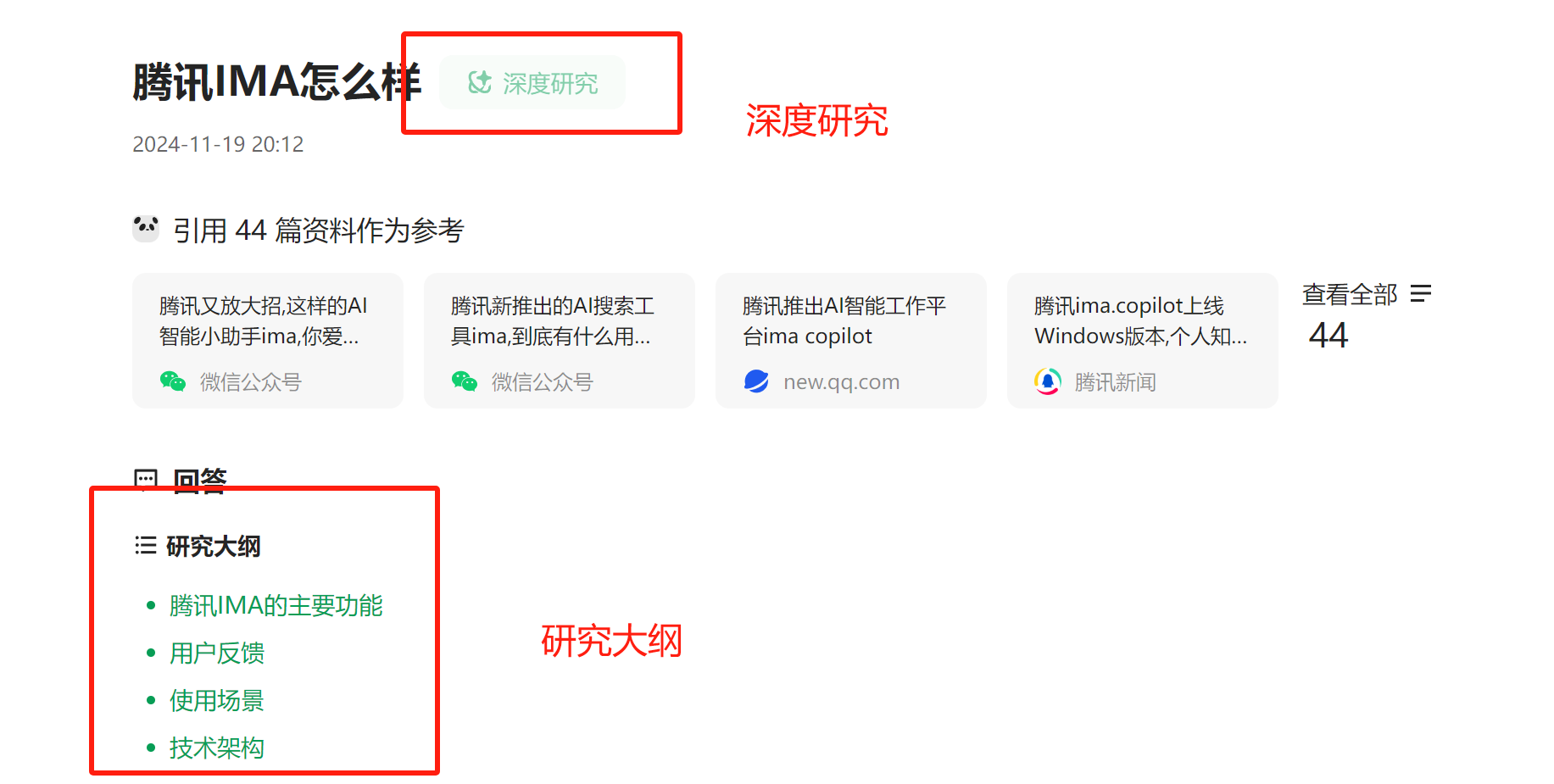 进一步点击“深度研究”,则能从更大范围的内容中总结出 大纲: