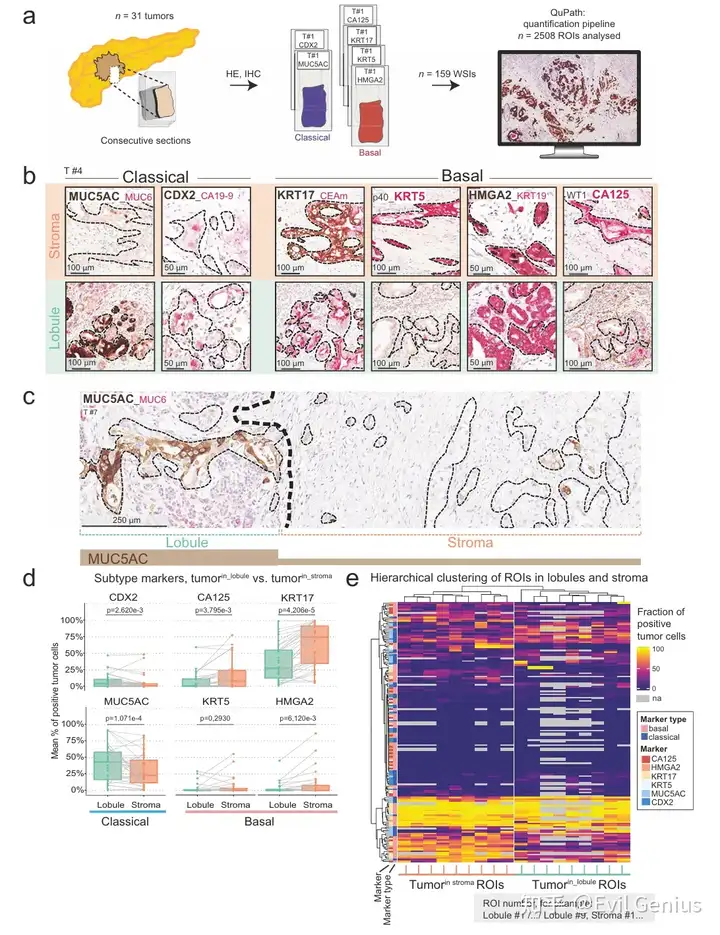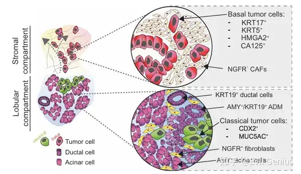 研究证实胰腺小叶是一个富含经典型肿瘤细胞的独特肿瘤分区,而基底样表型则在间质区域占据主导。