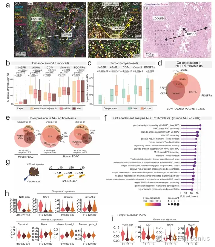 在人类与小鼠胰腺肿瘤中,NGFR⁺小叶成纤维细胞仅部分重叠于已知的CAF亚型(肌纤维母细胞性CAF表达ASMA、炎症性CAF表达PDGFRα、抗原呈递性CAF表达CD74)。通过空间表型分析发现,小叶侵袭区域的NGFR⁺基质细胞高比例共表达PDGFRα(94%),而与ASMA(22%)或CD74(34%)共表达程度较低,且该类细胞在促纤维增生间质中显著缺失。单细胞转录组数据进一步证实NGFR⁺细胞在所有数据集中均与PDGFRα呈现最强共表达,并富集免疫调节相关基因特征。时间动态分析显示,在小鼠肿瘤进展早期及人类较小肿瘤(T1期)中NGFR⁺基质特征更为显著,同时伴随经典肿瘤表型富集;而随着肿瘤进展至晚期/较大体积,NGFR表达逐渐被基底样/间充质表型取代。这些证据共同揭示了NGFR⁺/PDGFRα⁺基质细胞是定位于炎症小叶的特殊群体,其表达随肿瘤侵袭推进而衰减,标志着从早期损伤相关微环境向晚期促纤维增生间质演变的关键动态过程。