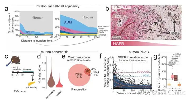 在胰腺导管腺癌(PDAC)的进展过程中,肿瘤细胞通过定植受损的胰腺小叶实现侵袭。这一过程的核心特征是:在肿瘤-外分泌细胞边界的前沿区域,聚集着一群独特的NGFR阳性成纤维细胞群。这些细胞与急慢性胰腺损伤密切相关,其表达强度随肿瘤浸润深度及小叶萎缩程度呈现动态变化,在轻度至中度萎缩的损伤小叶中表达最为显著。该细胞群体虽表达炎症相关成纤维细胞(iCAF)标志物PDGFRα,却不同于典型的肌成纤维细胞性CAF(myCAF)或抗原呈递CAF(apCAF),标志着一种与组织修复和慢性炎症相关的特殊微环境状态。这一发现不仅揭示了PDAC侵袭前沿的独特细胞生态,更阐明了肿瘤细胞如何利用损伤-修复机制塑造利于其定植的微环境,为理解PDAC的病理演进提供了新视角。