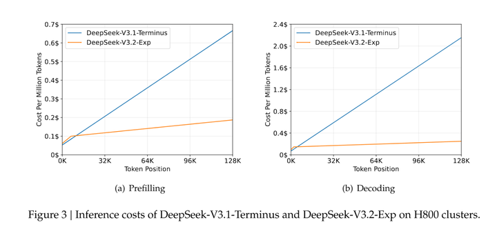 (1)发布时机:依旧选择在重大节假日前夕亮相,节奏把控精准,但也让下游开发者猝不及防。 (2)技术亮点:引入 DSA(DeepSeek Sparse Attention),通过 Lightning Indexer + Top-k Token Selection,将复杂度从 O(L²) 降到 O(LK),大幅优化长上下文处理效率。 (3)价格调整:因推理效率提升,API 成本显著下降,官方立刻下调服务价格,降低了应用落地门槛。 (4)性能表现:尽管采用稀疏注意力,但整体能力与 V3.1-Terminus 基本持平,尤其在长上下文任务中展现出更优的性价比。