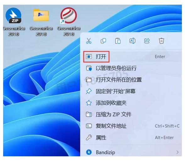现在可以测试软件是否安装成功了。回到桌面,右键【Geomatica 2018软件图标】,点击【打开】。