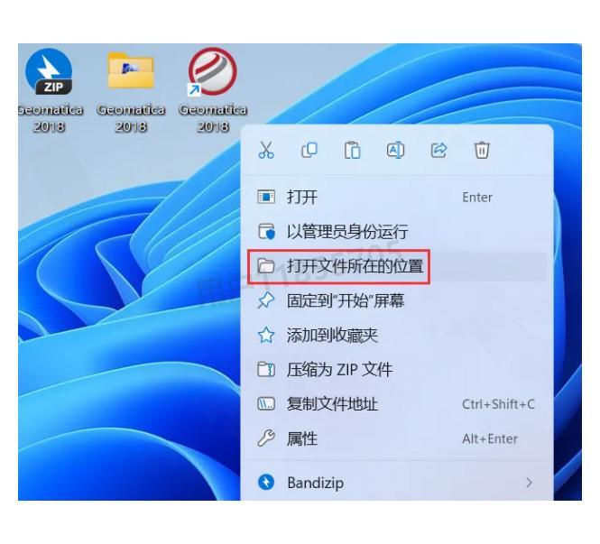 接下来要找到软件的安装目录。右键桌面上的【Geomatica 2018软件图标】,点击【打开文件所在的位置】。