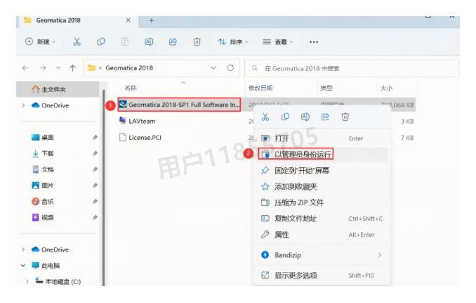 找到【Geomatica 2018-SP1】应用程序,记得一定要右键选择【以管理员身份运行】。这个操作很关键,我之前就是因为没有用管理员权限运行,结果安装到一半就报错了。