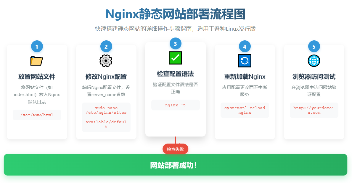• 保存配置文件后,先执行 nginx -t 检查语法是否正确。