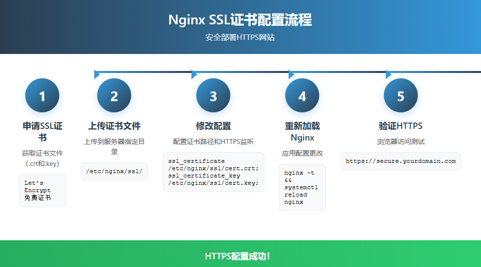 HTTPS 是绝大多数网站安全的标配。Nginx 可以轻松配置 SSL 证书,给网站启用加密传输。