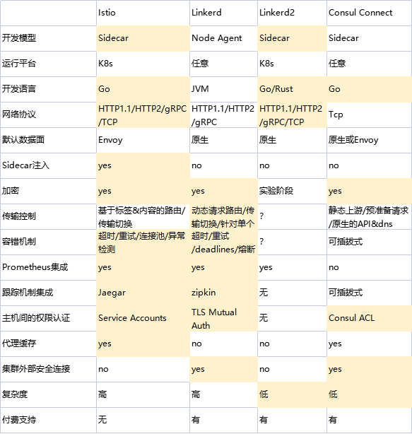 Isito的核心功能大致有5点:流量管理、安全、可观察性、平台独立、集成和定制,相比其他 Service Mesh工具,我们用一张图说明Istio所存在的优势。