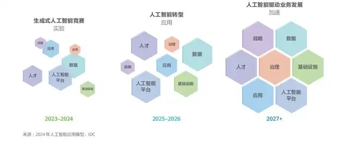 应用期(2025-2026 年):战略对标,整合 AI 平台、治理框架,从试点转向规模化集成;