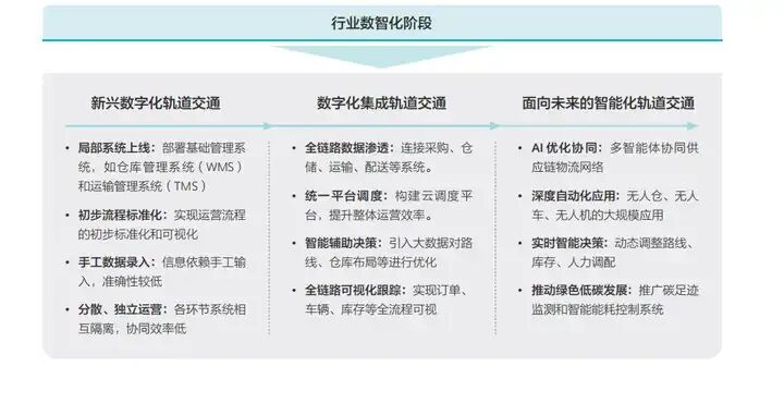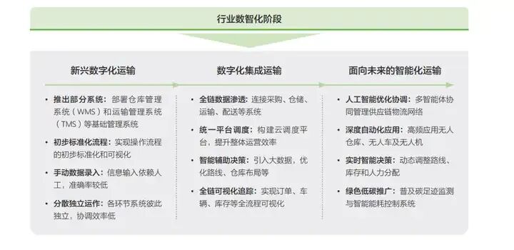 转型三阶段:新兴数字化运输(部署 WMS/TMS、分散运营)→数字化集成运输(全链可视化、智能辅助决策)→面向未来智能化运输(AI 协调、绿色低碳)。