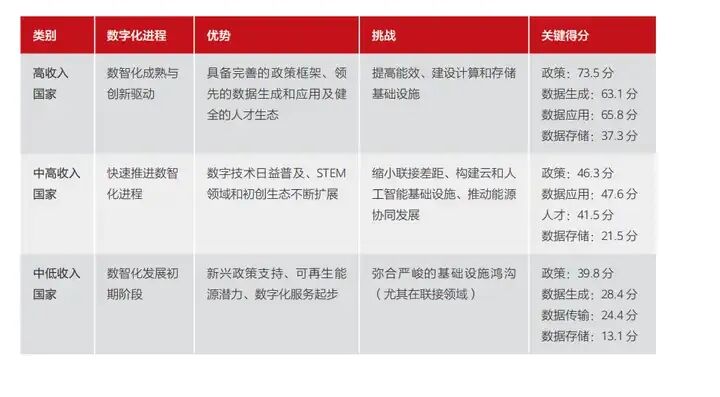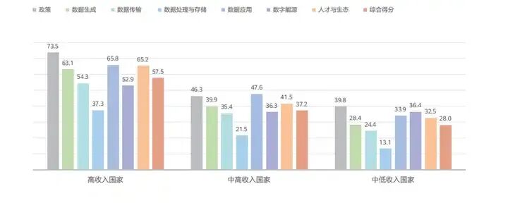 (1)高收入国家(42 个) 整体特征:平均政策得分 73.5 分、数据应用 65.8 分、人才与生态 65.2 分,数据处理与存储仅 37.3 分;需加强网络、计算、存储、绿色能源协同,提升存储与算力效率。