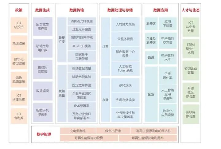 七大评估支柱:数据生成、数据传输、数据处理与存储、数据应用、数字能源、政策、人才与生态,各支柱权重通过因子分析确定(数据传输 25%、数据生成 20%、数据处理与存储 15%,其余四项各 10%)。