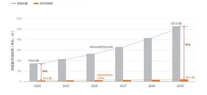 数据存储:全球数据生成量增速(2024-2029 年 CAGR 约 24.9%)远超存储规模增速(CAGR 约 13.6%),2030 年超 94% 生成数据将面临废弃或丢失风险,全闪存存储、绿色数据中心成为关键需求。