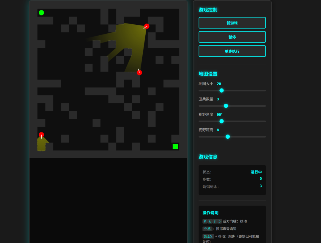 UI:地图大小/卫兵数量/视野角度;暂停/步进。