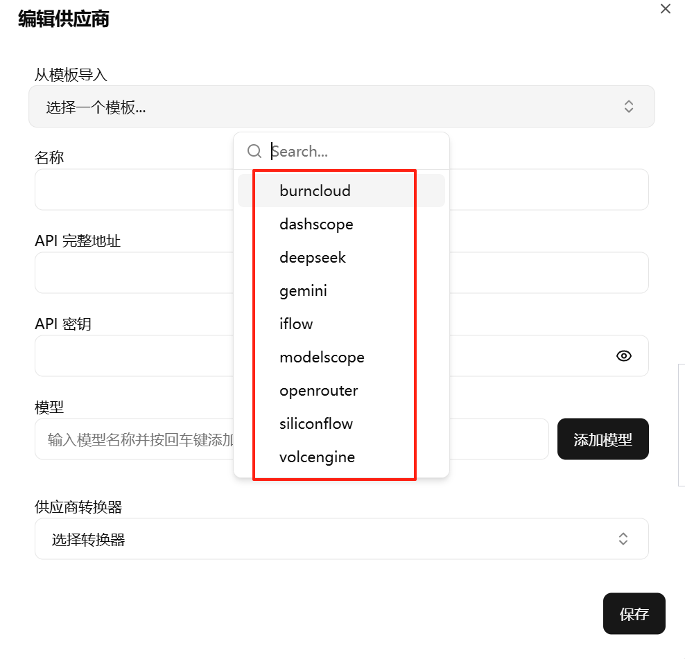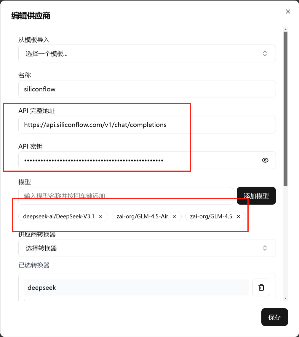 选择供应商之后,你只要把api key和你想用的模型填进去就行了。并把供应商转换器选择为Anthropic。