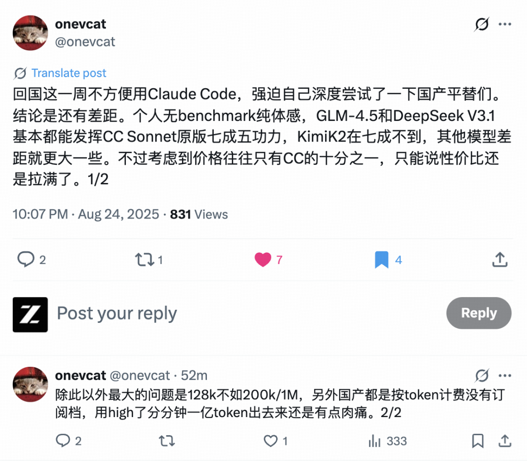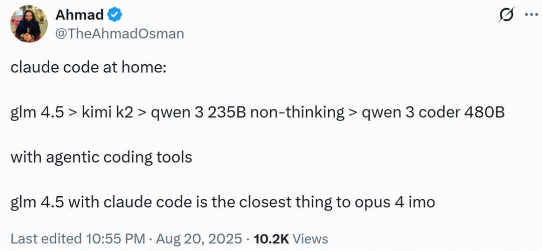 如果不使用Claude,考虑性价比,我可能会选择GLM4.5 + Claude Code。