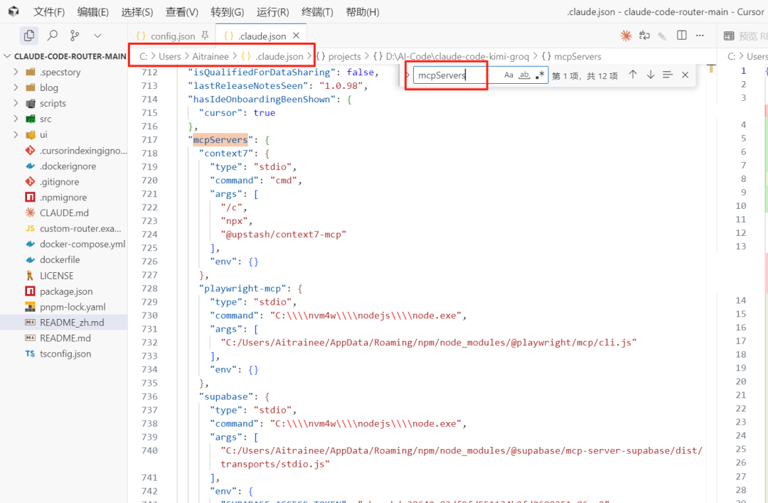 你先需要知道。claude code mcp的配置信息是放在这个.claude.json文件里的,用“mcpServers”搜索一下会发现两个配置的地方,按顺序第一个是项目级,第二个是用户全局。我一般直接滑到末尾配置这个全局的。
