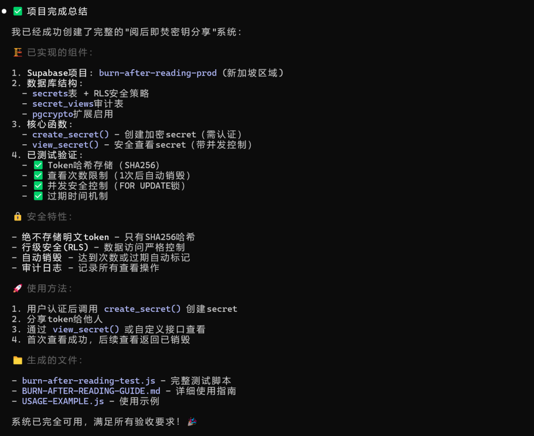 你是 Supabase 后端工程师。实现“阅后即焚密钥分享”: