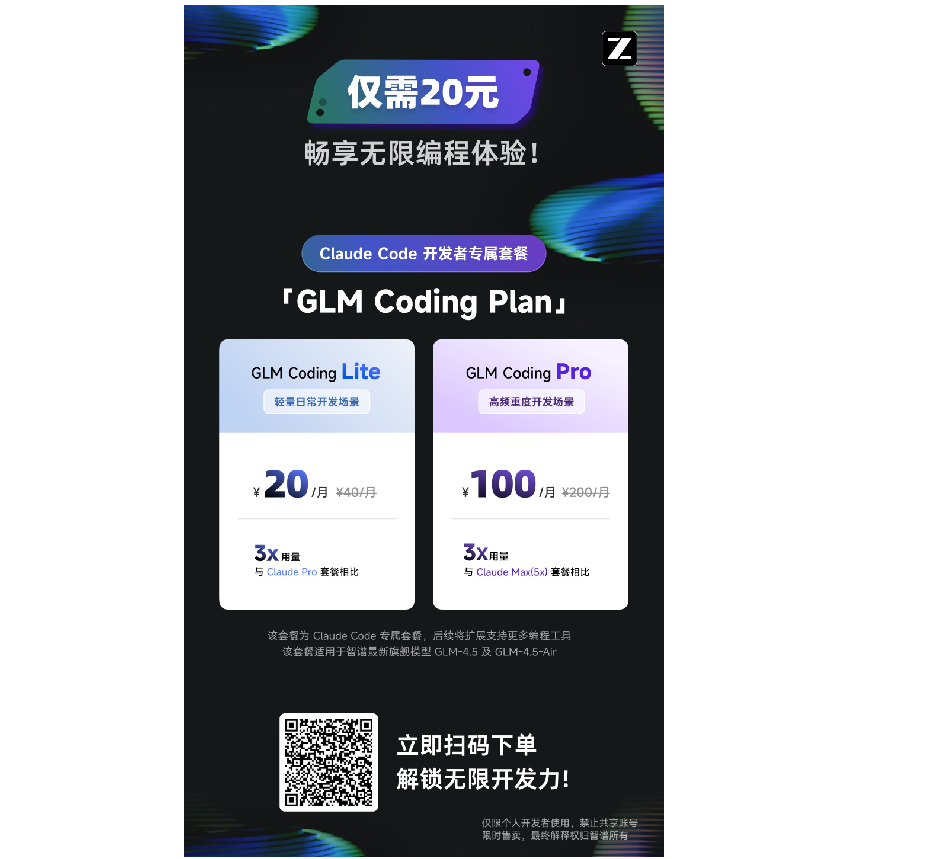 点击下方“阅读原文”可直接获取GLM + Claude Code代码编程专享计划 20元包月活动,价格也确实很优惠了,性价比高。