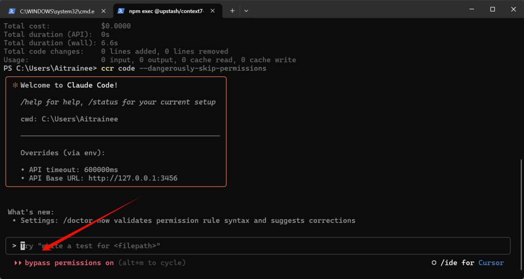 装好后以:ccr code --dangerously-skip-permissions 启动,--dangerously-skip-permissions 表示给予最大权限。不需要每次都同意。