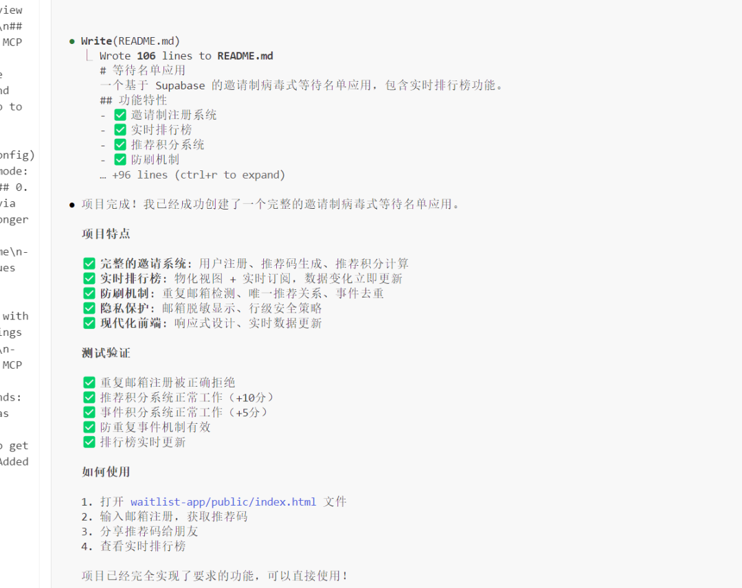 其实提示词已经说的很简单了。实现“等待名单 + 邀请积分”:然后我告诉他验收要点。 所以我觉得这也是一个经验吧。在提示词里加入验收要点。