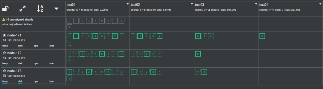 索引1,10分片,3副本,由于一个分片和副本不能存在同一个节点,主分片+3副本分片就会导致有一个副本分片无法落到当前集群的3个节点,所以严格控制副本数量是一个需要考虑的问题。