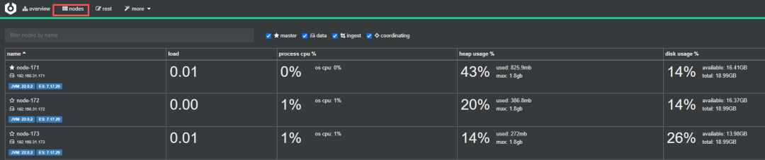 这里其实和CMAK有点类似,需要在这里填入ES地址,也可以在配置文件里面定义。填写正确的ES以后,就可以看到我们当前集群信息,比如我们当前集群的节点数量,索引数量,分片数量,文档数量等信息。