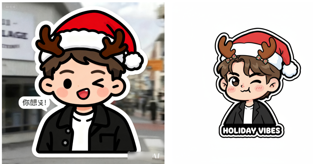 把角色变成一个可爱的卡通贴纸,大胆的轮廓,俏皮的面部表情,和一个简短的白色标题。保持原始身份的一致性。