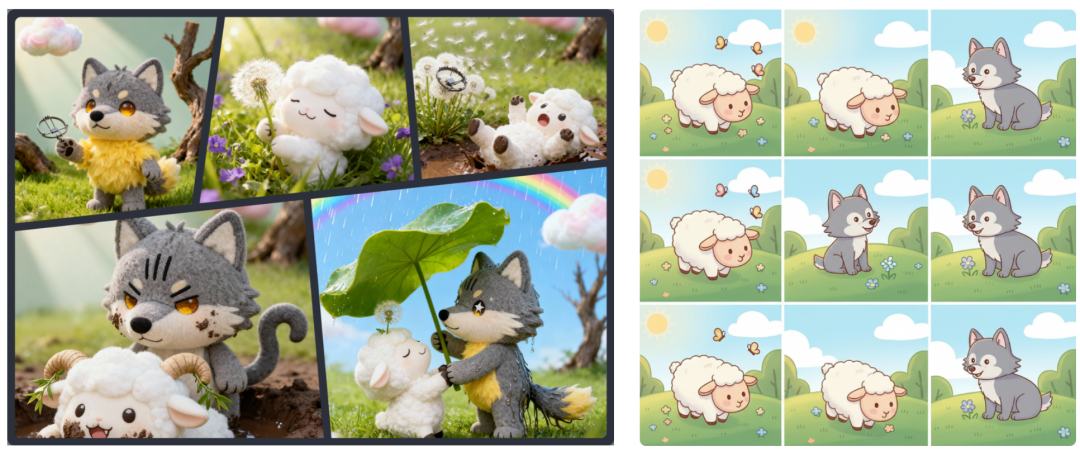 生成多图,生图比例是3/4,一共有6个分镜,画风整体是 Q 版治愈风,故事内容是狼抓羊的故事