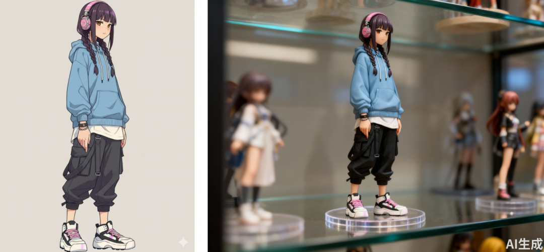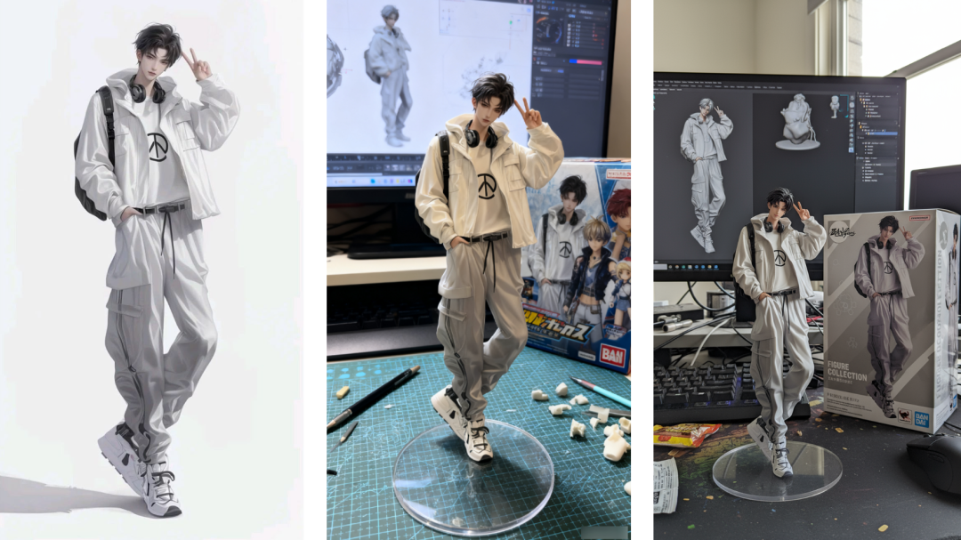 左边两个是我前面一篇文章说的基于nana-banana做的两个视频,右边是Seedream4.0采用相同的提示词制作手办图片的效果:
