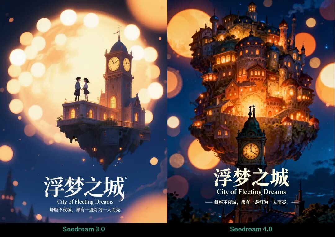 使用同样prompt,分别用 Seedream 3.0 和 Seedream 4.0 生成海报,Seedream 4.0不仅能生成4K高清图,并且在细节和美感上更胜一筹