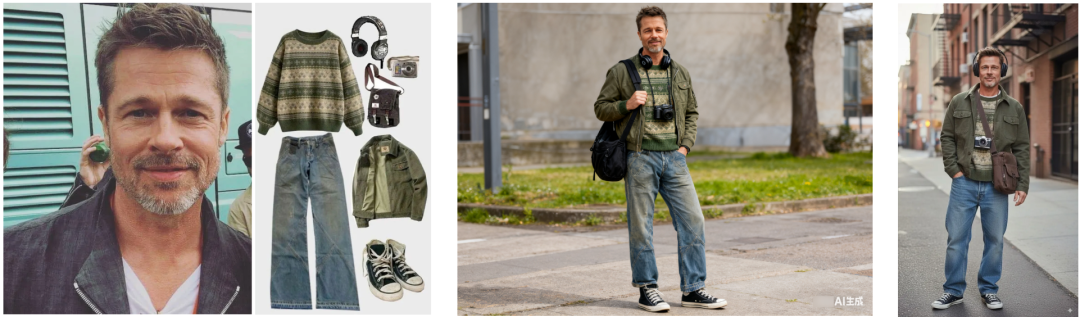 选择图1中的人,让他们穿上图2中的所有服装和配饰。在户外拍摄一系列写实的OOTD风格照片,使用自然光线,时尚的街头风格,清晰的全身镜头。保持图1中人物的身份和姿势,但以连贯时尚的方式展示图2中的完整服装和配饰