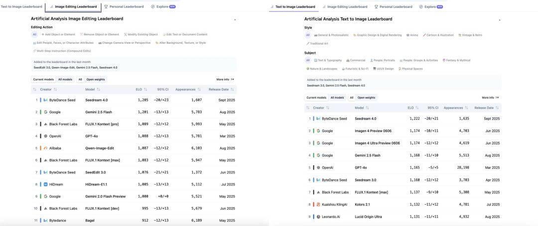 这两天还上了 Artificial Analysis「文生图」和「图像编辑」两大榜单的第一: