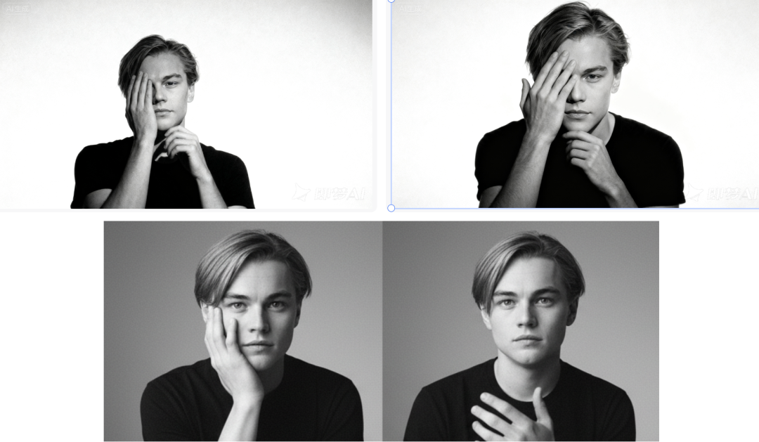 高分辨率的黑白肖像摄影作品,采用编辑类与艺术摄影风格。保持人物面部特征一致,仅改变姿态与构图。背景为柔和渐变,从中灰过渡到近乎纯白,配合细腻的胶片颗粒质感,营造经典黑白影像的氛围。主体为同一位男生,穿着 黑色 T 恤,以不同随机姿态出现:抬手触脸、手指交叠于胸前、用手部分遮挡面容、轻触下颌等,强调自然、优雅的手部动作。面部依旧保留原有神态,只在角度和光线中体现变化,局部捕捉眼神、颧骨或唇角的细节。光线为温柔的定向光,柔和地勾勒出脸部、手部与 T 恤的纹理;画面简洁,留有大面积负空间。没有文字或标志,只有光影、姿态与情绪交织。整体氛围亲密、永恒,像呼吸或思索间的停顿,被捕捉为诗意的瞬间。