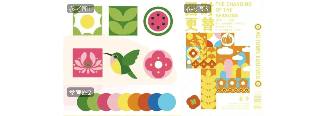 prompt:使用图1中的6个图案元素,可以延展出类似的图案,进行组合,生成创作4张分别是春分、夏至、秋分、冬至的“四时更替”海报,同系列,整体风格保持一致,白色背景,每张对应图2的季节色彩,画面效果和排版方式参考图3。