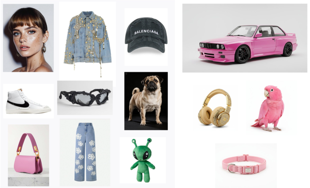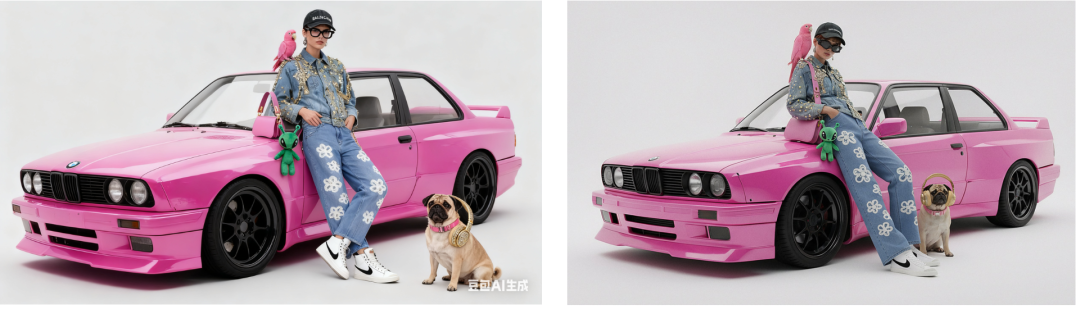 一个模特摆姿势靠在粉色宝马车上。她穿着以下物品,场景背景是浅灰色。绿色外星人是一个钥匙扣,挂在粉色手提包上。模特肩上还有一只粉色鹦鹉。旁边坐着一只戴着粉色项圈和金色耳机的哈巴狗