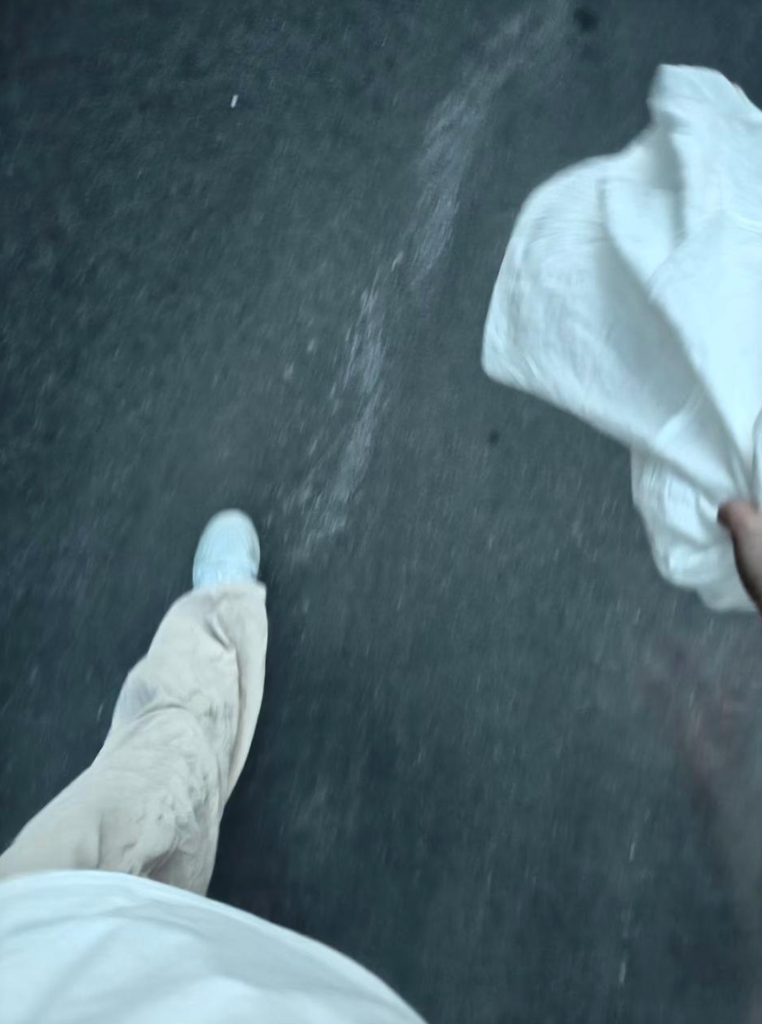 在沥青地上撒上几片干爽的秋叶,巧妙地修饰了一下场景。树叶也应该有运动模糊,与行走运动一致。不要改变其他任何东西。