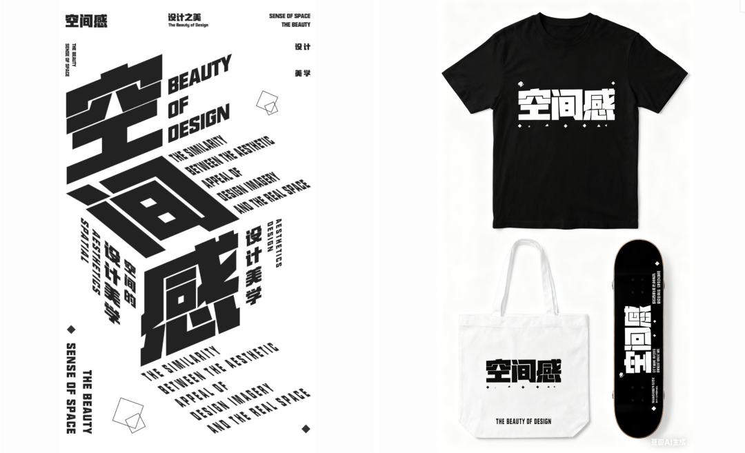 将这张海报的核心图形‘空间感’作为主要元素,设计一组潮流周边产品,包括黑色T恤、帆布袋和滑板。风格要保持高度一致。