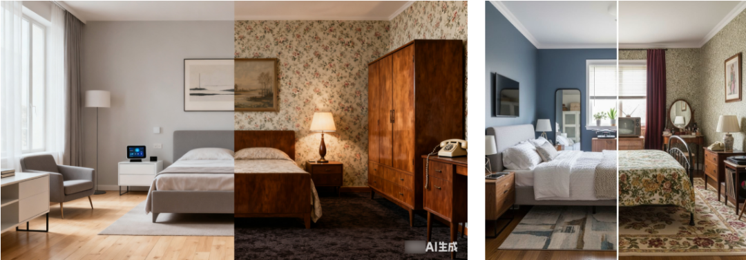 一张卧室的照片,从中间分开,左边是 2018 年,右边是 1964 年,是同一个房间