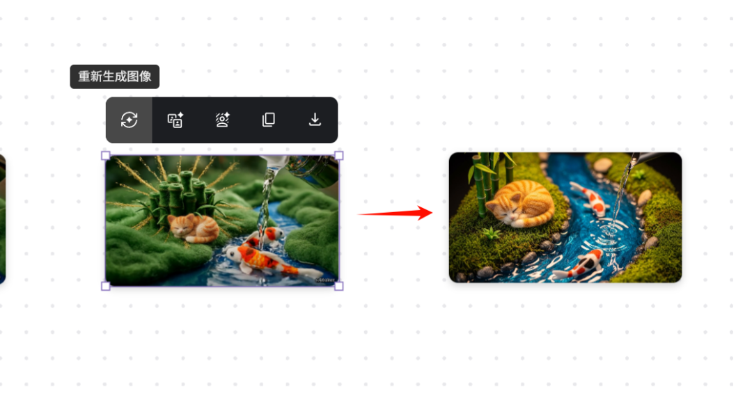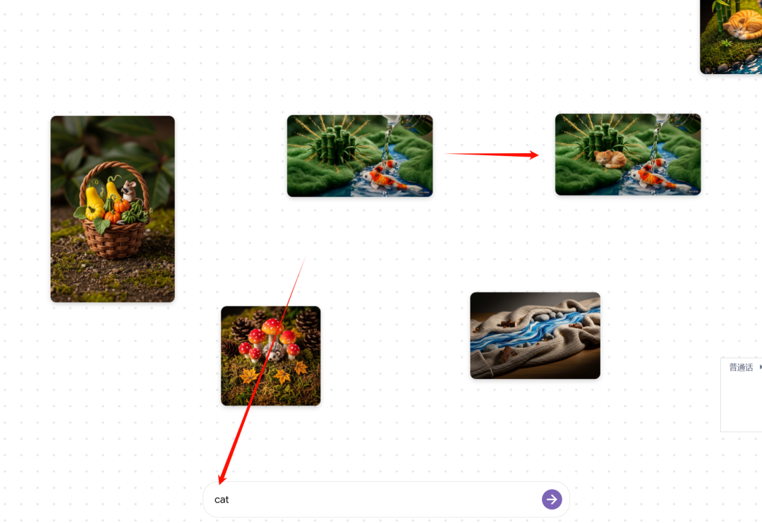 比如我选中了自己创建的这个竹子+鱼的图像,输入:cat,他就会在原图像增加:猫。材质贴合原来的场景。