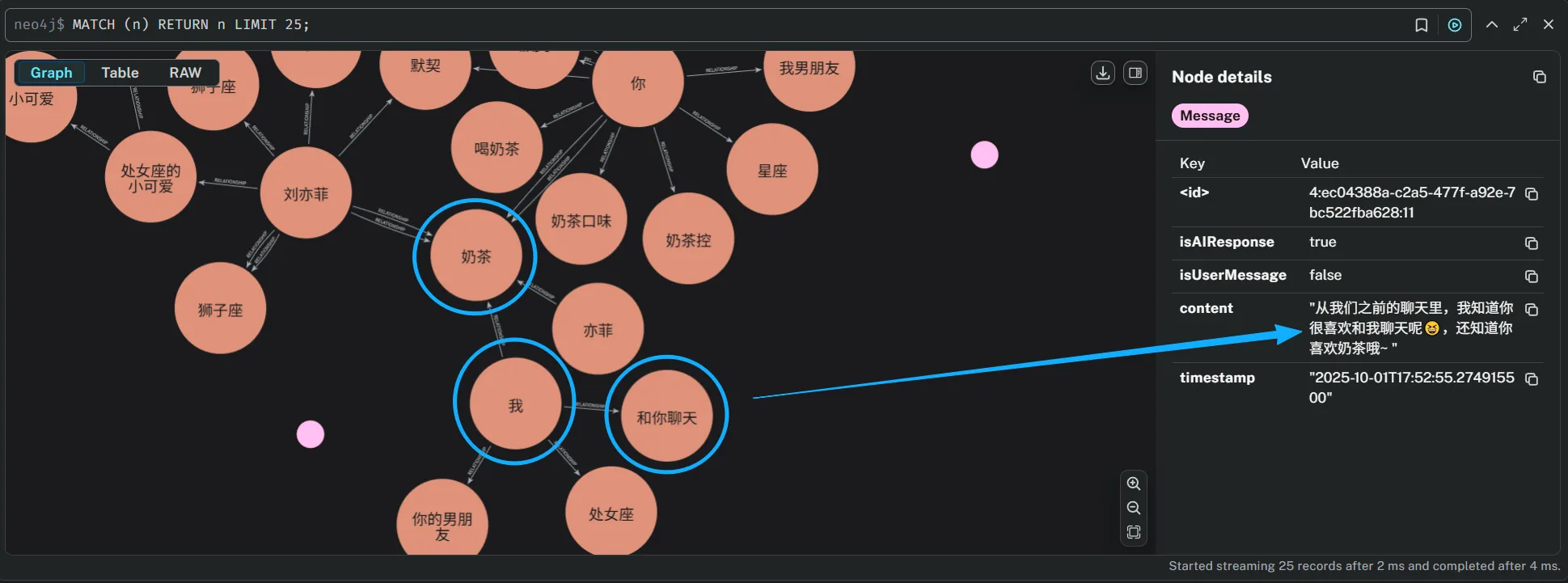 测试一下记忆功能是否正常,向AI伴侣说我喜欢奶茶后查看Neo4j的图结构,可以看到已经将“我”和“奶茶”进行了关联,并且关联关系是“喜欢”。