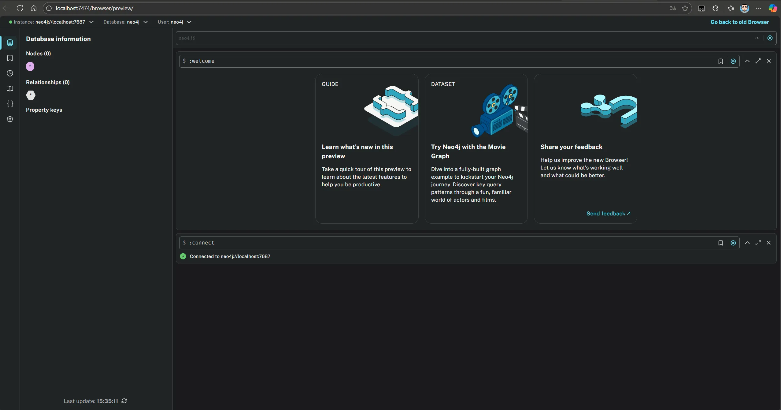 进入界面后,输入刚刚在docker-compose中配置的密码即可进入Neo4j自带的可视化界面。
