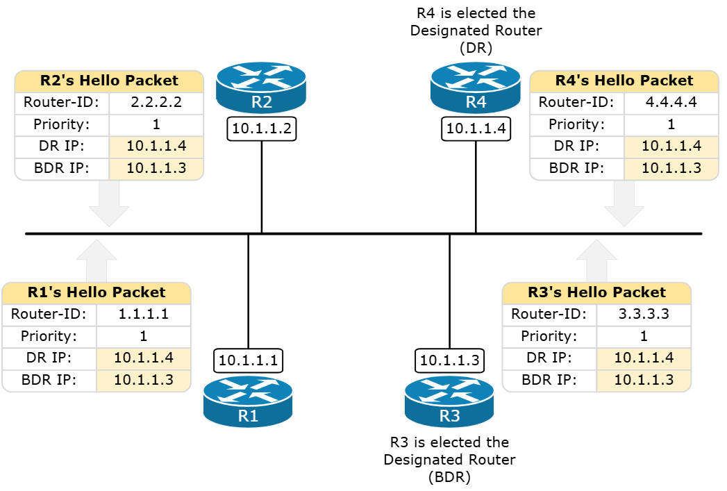 对于多路访问网络,譬如以太网的广播网络,网络内的所有路由器会先选择DR(指定路由器)和BDR(备份指定路由器)。DR/BDR的选择机制是基于Hello包内携带的优先级参数(0-255),其规则如下:
