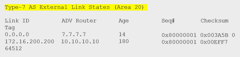 LSA Type 7 | OSPF Not So Stubby Area (NSSA) External LSA | |