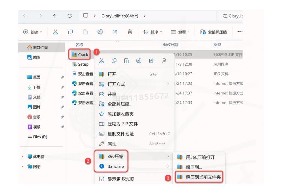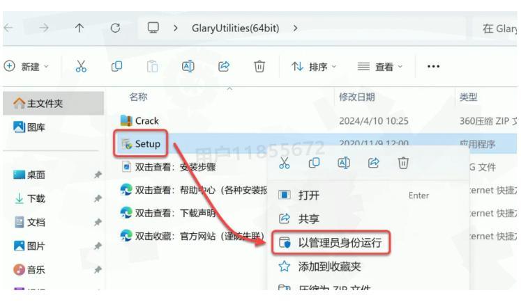 Glary Utilities Pro 详细安装教程 首先解压安装包: 右击【GlaryUtilities(64bit)】压缩文件 选择你电脑上的解压工具(比如360压缩、WinRAR等都行) 点击【解压到GlaryUtilities(64bit)】选项 打开解压后的文件夹,找到【Setup】文件,右击选择【以管理员身份运行】。这一步很关键,管理员权限能避免安装过程中的各种权限问题。 在安装向导窗口中点击【下一步】继续。 阅读软件协议后,点击【我接受】同意条款。 选择D盘安装能节省C盘空间,提升系统运行速度。具体操作是修改路径地址中的第一个字母C,改成D就可以安装到D盘。选好后点击【下一步】。 确认信息无误后,点击【安装】开始安装过程。 系统正在安装中,这个过程通常不会太久,耐心等待一下就好。 安装完成后,取消勾选【运行】选项,然后点击【完成】。这样可以避免软件直接启动,我们还有后续步骤要完成。 在弹出的界面点击【立即激活】(记得不要关闭此界面,我们待会还要用)。 回到之前解压出来的【GlaryUtilities(64bit)】文件夹: