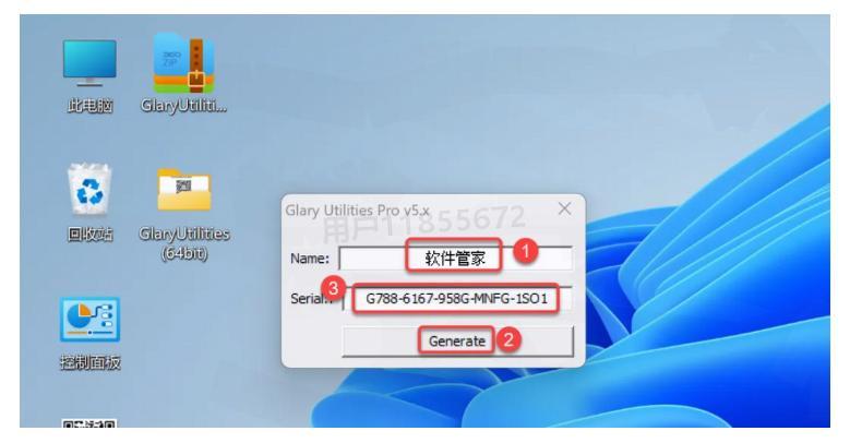 输入【软件管家】作为用户名 点击【Generate】按钮生成许可证 复制生成的激活码备用 输入【软件管家】作为用户名 点击【Generate】按钮生成许可证 复制生成的激活码备用 切回到第9步的激活窗口: